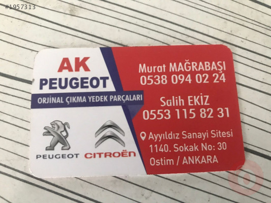 AK PEUGEOT OLARAK ANKARA AYYILDIZ SAN. SİT. HİZMET VERMEKTEYİZ. İLANLARIMIZ ARASINDA BULAMADIĞINIZ PARÇALAR İÇİN BİZİMLE İLETİŞİME GEÇEBİLİRSİNİZ. PARÇALARIMIZ TAMAMEN ORİJİNAL VE MUAYENDİR. BİZİMLE İLETİŞİME GEÇEREK PARÇANIN DETAYLARINI ÖĞRENE BİLİRSİNİZ. KOLAYCA ELDEN VEYA ANLAŞMALI KORGOMUZ İLE SİPARİŞ VEREBİLİRSİNİZ. YILLARIN TECRUBESİ İLE SİZLERE EN UYGUN VE KALİTELİ PEUGEOT & CITROEN PARÇALARINI ULAŞTIRIYORUZ.