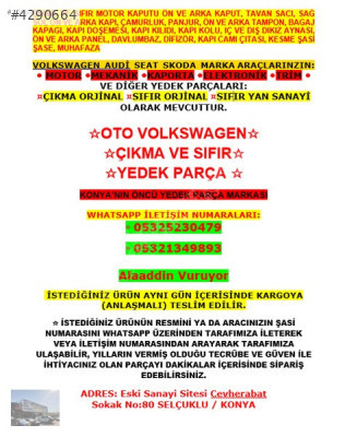 ÇIKMA VE SIFIR MOTOR KAPUTU ÖN VE ARKA KAPUT, TAVAN SACI, SAĞ SOL ÖN VE ARKA KAPI, ÇAMURLUK, PANJUR, ÖN VE ARKA TAMPON, BAGAJ KAPAĞI, KAPI DÖŞEMESİ, KAPI KİLİDİ, KAPI KOLU, İÇ VE DIŞ DİKİZ AYNASI, ÖN VE ARKA PANEL, DAVLUMBAZ, DİFİZÖR, KAPI CAMI ÇITASI, KESME ŞASİ ŞASE, MUHAFAZA